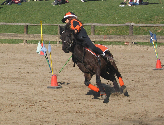 | aujourd hui laora floppy vont faire un entrainement de pony game je commence par laora je la brosse dans son box apres lui avoir mis le filet et la selle je lui mets des protections elle est un peu surprise ,elle n a pas l habitude pour qu elle s habitue a porte des protections je la marche a pied dans le manege ou j ai deja prepare des staloms des drapeaux des plots ... enfin tout ce qui est neccessaire pour le poney game au bout de quelques tours je trouve que laora ne fait meme plus attention a ses protections ,alors je m arrete ,je ressangle et je monte en selle je marche au pas quelques instants ,fait quelques figures aux 2 mains je fais la meme chose pour le trot et le galop maintenant peu commence l entrainement de pony game slaloms au trot et galop de + en + rapidement